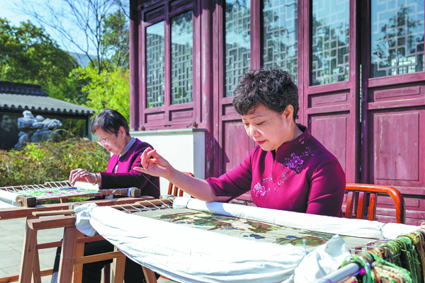 Qi Qiulan (right) and her mother work on embroidery patterns in their workshop in Suzhou, Jiangsu province. [Photo provided to China Daily]